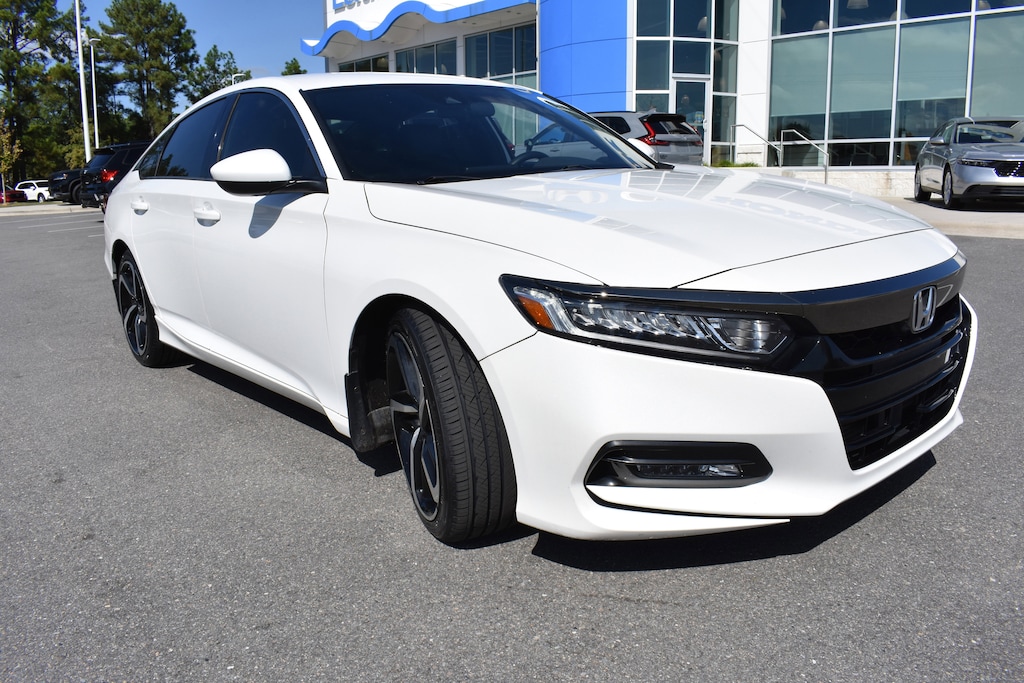 CARFAX One-Owner. Certified. Platinum White Pearl 2018 Honda Accord Sport FWD CVT 1.5T I4 DOHC 16V Turbocharged VTEC 4-Wheel Disc Brakes, 8 Speakers, ABS brakes, Air Conditioning, Alloy wheels, AM/FM radio, Apple CarPlay/Android Auto, Auto High-beam Headlights, Automatic temperature control, Brake assist, Bumpers: body-color, Cloth Seat Trim, Delay-off headlights, Dual front impact airbags, Dual front side impact airbags, Electronic Stability Control, Emergency communication system: HondaLink, Exterior Parking Camera Rear, Four wheel independent suspension, Front anti-roll bar, Front dual zone A/C, Front fog lights, Fully automatic headlights, Illuminated entry, Knee airbag, Leather Shift Knob, Leather steering wheel, Low tire pressure warning, Occupant sensing airbag, Outside temperature display, Overhead airbag, Panic alarm, Power door mirrors, Power driver seat, Power steering, Power windows, Radio data system, Radio: 180-Watt AM/FM Audio System, Rear anti-roll bar, Rear window defroster, Remote keyless entry, Security system, Speed control, Speed-sensing steering, Speed-Sensitive Wipers, Split folding rear seat, Spoiler, Steering wheel mounted audio controls, Tachometer, Telescoping steering wheel, Tilt steering wheel, Traction control, Trip computer, Variably intermittent wipers, Wheels: 19" Machine-Finished Alloy w/Black Inserts.