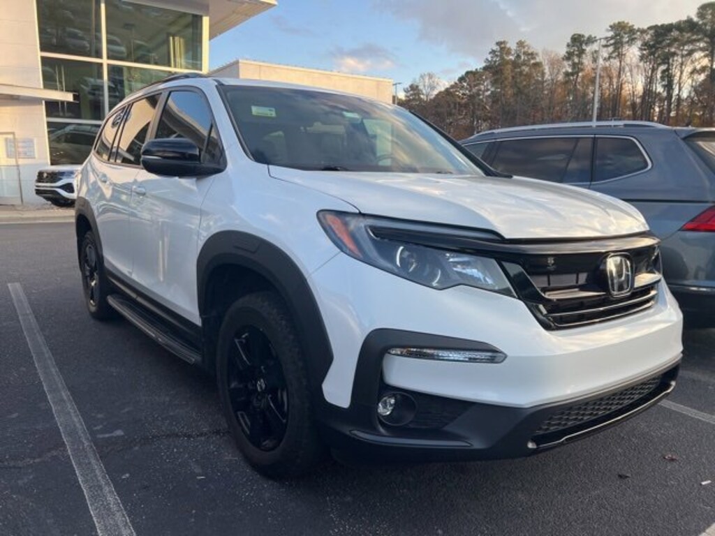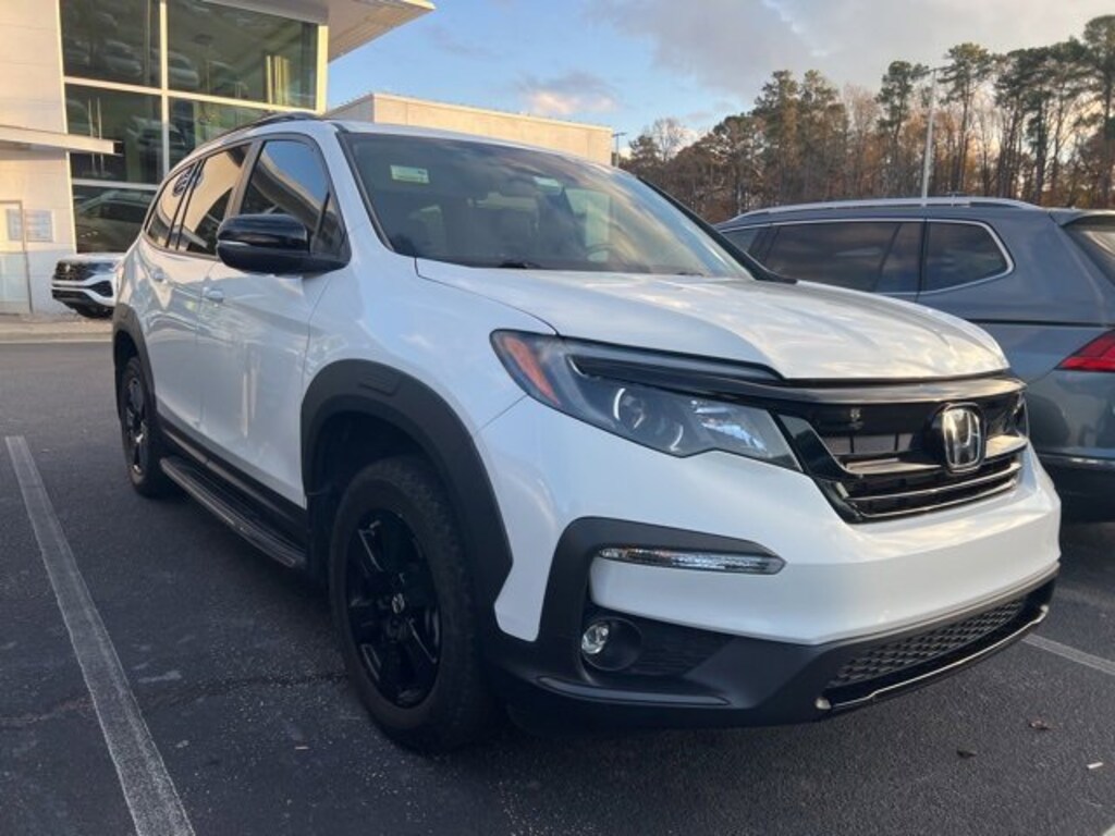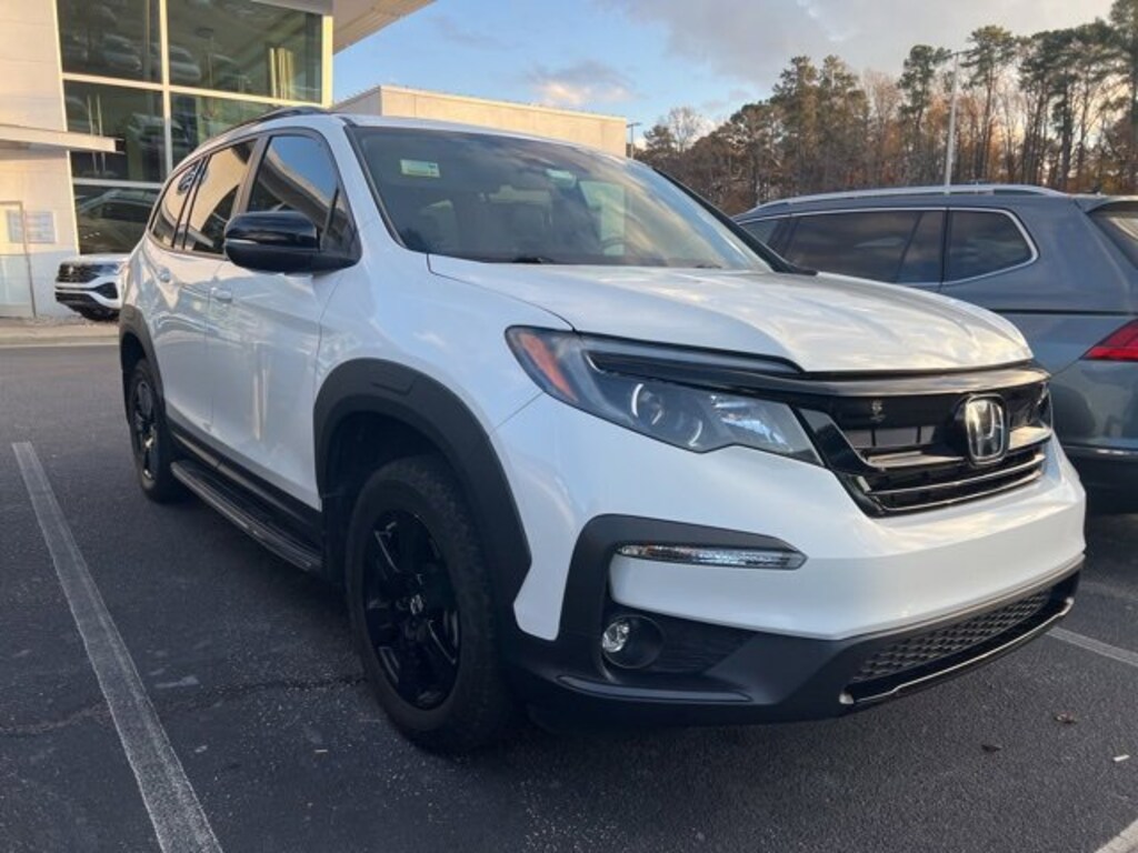 White 2022 Honda Pilot TrailSport AWD 9-Speed Automatic 3.5L V6 24V SOHC i-VTEC AWD, 3rd row seats: split-bench, Apple CarPlay/Android Auto, Auto High-beam Headlights, Blind Spot Information (BSI) System warning, Exterior Parking Camera Rear, Forward collision: Collision Mitigation Braking System (CMBS) + FCW mitigation, Fully automatic headlights, Garage door transmitter: HomeLink, Heated door mirrors, Heated Front Bucket Seats, Illuminated entry, Lane departure: Lane Keeping Assist System (LKAS) active, Power driver seat, Radio: 215-Watt Audio System, Reclining 3rd row seat, Wheels: 18" Exclusive Gloss Black Alloy.