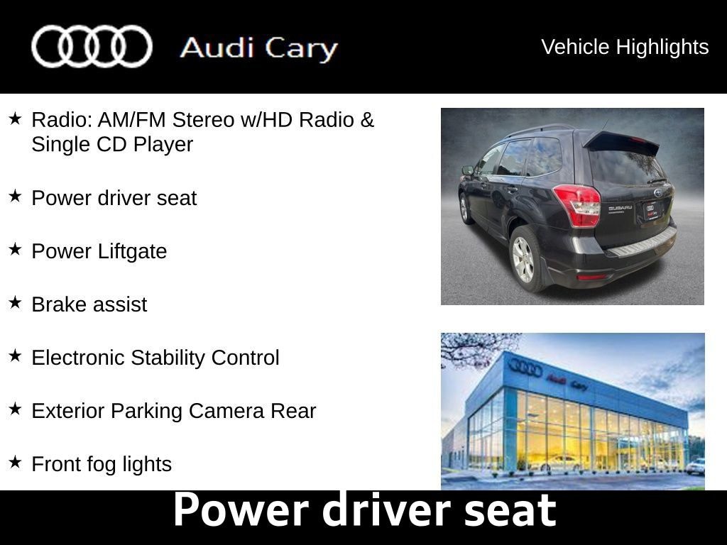 Dark Gray Metallic 2014 Subaru Forester 2.5i Limited Lineartronic CVT 2.5L 4-Cylinder DOHC 16V VVT AWD CARFAX One-Owner. Clean CARFAX. Brake assist, Electronic Stability Control, Exterior Parking Camera Rear, Front fog lights, Panic alarm, Power driver seat, Power Liftgate, Radio: AM/FM Stereo w/HD Radio & Single CD Player, Security system.