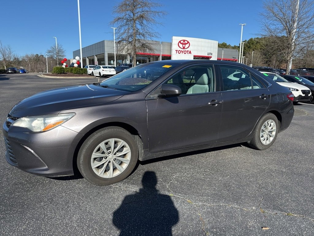 CARFAX One-Owner. Predawn Gray Mica 2016 Toyota Camry LE FWD 6-Speed Automatic 2.5L I4 SMPI DOHC AS IS CAR, LOCAL TRADE IN, BACK UP CAMERA, MUST SEE TO APPRECIATE!, Ash w/Fabric Seat Trim, ABS brakes, Air Conditioning, Delay-off headlights, Electronic Stability Control, Exterior Parking Camera Rear, Fabric Seat Trim, Four wheel independent suspension, Front Center Armrest, Fully automatic headlights, Outside temperature display, Power driver seat, Power steering, Power windows, Radio: Entune Audio, Rear seat center armrest, Rear window defroster, Remote keyless entry, Steering wheel mounted audio controls, Telescoping steering wheel, Traction control, Wheels: 7.0J x 16 Steel.